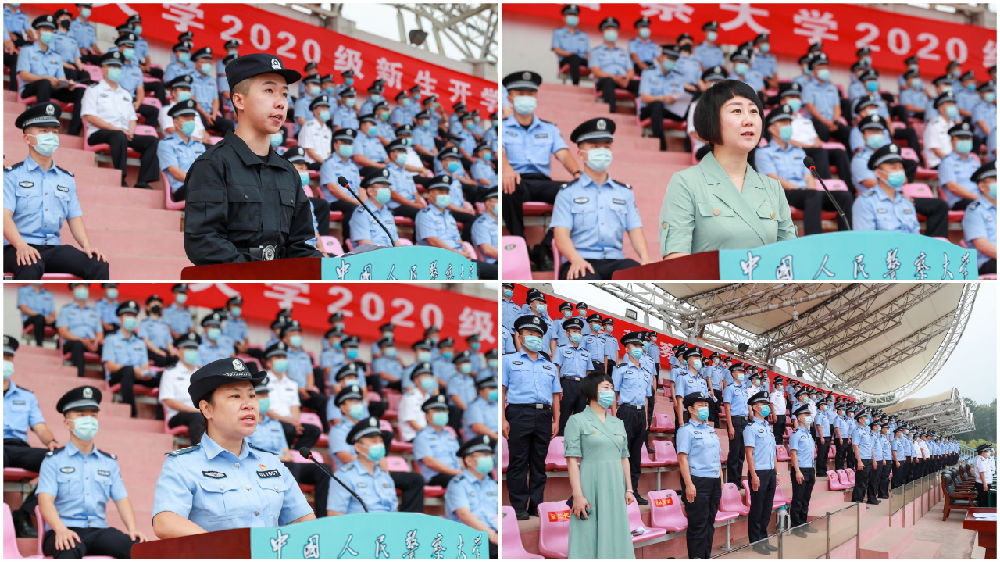 公安政治學院一隊李尚軒同學代表2020級全體新生發言,他鄭重承諾:將認真學習文化知識,堅定理想信念,提升綜合素質,錘煉實戰能力,培育創新精神,涵養家國情懷,努力成為德才兼備、文武雙全的共和國衛士,以實際行動為警大爭光,為警徽添彩。