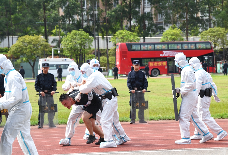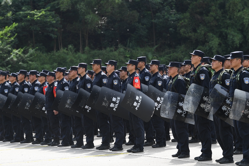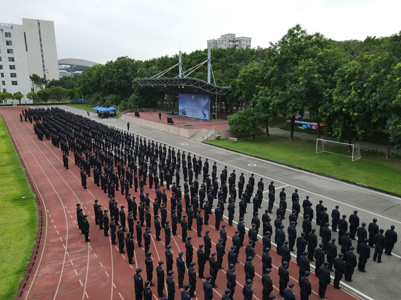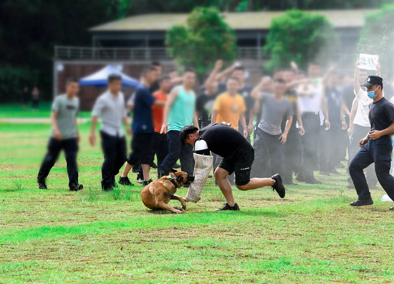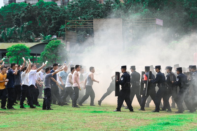 上午9時,伴隨著緊急集合號,798名參訓學員齊裝滿員僅用2分鐘15秒即從宿舍到綜合訓練場集合完畢。劉金廣主任以指揮長的身份立即宣布情況、下達開進命令和戰前動員,14個學員分隊聞令而動,邊蹬車邊穿戴防護服,邊開進邊補充任務。在處突階段,演練以廣東省南部地區新一輪疫情背景下,緊急拉動處置口岸突發事件為基本想定。首先在模擬邊檢大廳處置了擾亂秩序和“政治快閃”事件,緊接著在廣州市公安局無人機中隊和警犬中隊配合下,各學員分隊密切協同處置了口岸群體性突發事件。隨后演練隊伍迅速集結,劉金廣主任以總導演的身份作了演練講評,對參訓學員表現出的戰斗作風和學習態度給予充分肯定,同時針對演練中暴露出來的問題,要求學員進一步加快警察身份轉變,不斷增強法律意識,靈活運用戰術戰法,切實提升實戰本領,并感謝局領導和機關給了校區和學員在實戰訓練中學習提高的機會。