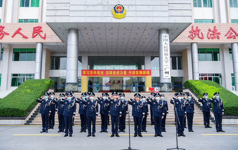 百年征程波瀾壯闊,百年奮斗氣壯山河。7月1日,廣州校區(qū)舉辦系列紀(jì)念活動(dòng)熱烈慶祝中國(guó)共產(chǎn)黨成立100周年。學(xué)校黨委委員、廣州校區(qū)黨委書(shū)記潘慈平,校區(qū)主任劉金廣及黨委委員出席活動(dòng),副處級(jí)以上領(lǐng)導(dǎo)干部全程參與活動(dòng),校區(qū)全體教職員工、國(guó)家移民管理局培訓(xùn)警員參加部分活動(dòng)。早上7:10,參加升警旗儀式的教職員工身著警禮服,警容嚴(yán)整、氣勢(shì)勃發(fā),在《中華人民共和國(guó)警歌》的莊嚴(yán)樂(lè)聲中,由紅藍(lán)兩色組成、彰顯人民警察隊(duì)伍絕對(duì)忠誠(chéng)、代表人民警察守護(hù)平安的警旗冉冉升起。全體同志肅立注目,向警旗致以崇高的敬禮。升旗儀式后,校區(qū)潘慈平書(shū)記帶領(lǐng)大家重溫《人民警察入警誓詞》,誓詞鏗鏘有力,精神昂揚(yáng)豪邁,信念愈加堅(jiān)定。