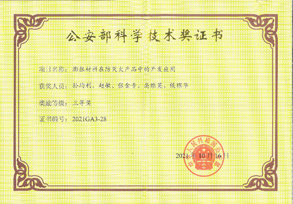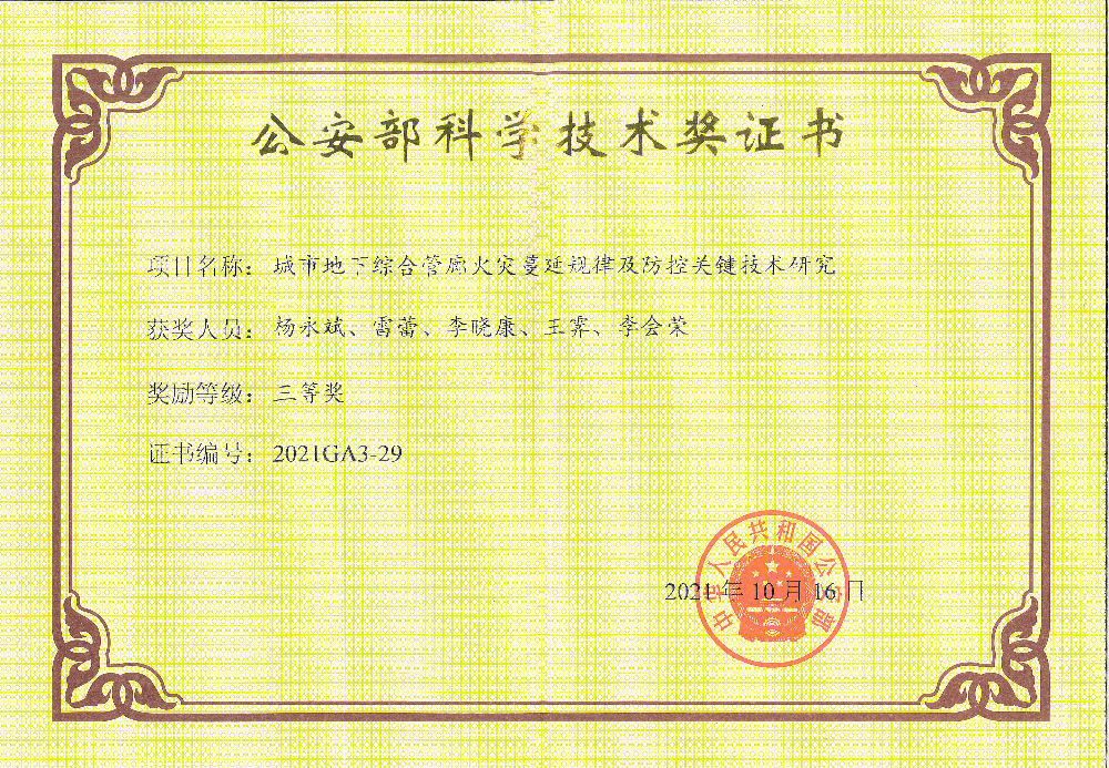 近日,公安部公布了2021年度公安部科學技術獎勵評審結果,由我校推薦,孫均利、趙敏、張金專、高維英、侯耀華等申報的《膨脹材料在防滅火產品中的開發應用》,楊永斌、雷蕾、李曉康、王霽、李會榮等申報的《城市地下綜合管廊火災蔓延規律及防控關鍵技術研究》共計2個項目均獲得公安部科學技術獎三等獎。