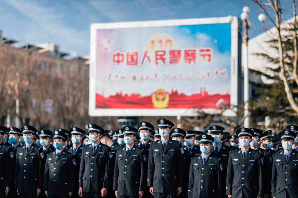 9時30分,43名儀仗隊員邁著堅定的步伐,護衛著中國人民警察警旗行進到旗桿前。在雄壯的中國人民警察警歌聲中,警旗冉冉升起。全體人員列隊整齊、警容嚴整、神情堅定,面向警旗莊嚴敬禮。