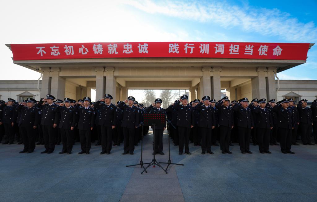 “我是中國人民警察,我宣誓”,馬金旗校長帶領全體人員面向警旗,高舉右拳莊嚴宣誓:“堅決擁護中國共產黨的絕對領導,矢志獻身崇高的人民公安事業,對黨忠誠、服務人民、執法公正、紀律嚴明,為捍衛政治安全、維護社會安定、保障人民安寧而英勇奮斗!”誓詞鏗鏘有力,擲地有聲,彰顯了斗志昂揚的精神風貌和獻身公安事業的堅定信念。