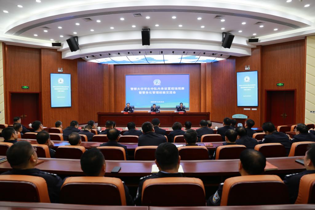 現場觀摩環節,參會人員觀摩了學校智慧警務學院十一隊、十二隊的學生宿舍內務設置,現場聽取學管干部關于隊伍日常管理的工作匯報。經驗交流環節,參會人員觀看了學校警務化管理示范片,6名學管干部代表分別從落實警務量化管理、狠抓隊伍紀律作風、著力強化政治引領、開發運用互聯網思維、緊密結合專業特色、融注真情嚴管厚愛等六個不同角度,交流分享了本單位開展隊伍警務化管理的方法經驗,案例鮮活、反響強烈、成效明顯。