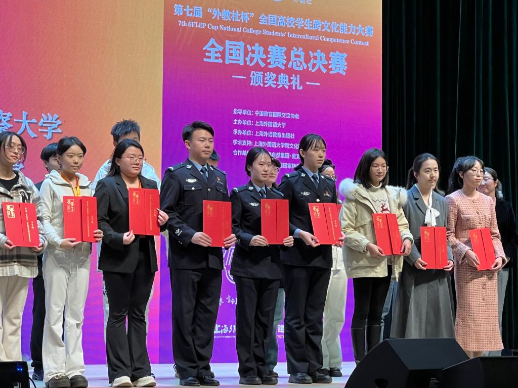 11月29日,由國際執法合作學院李一沐老師帶領的警大跨文化大賽團隊奔赴上海外國語大學,來到全國決賽的競技舞臺。全國決賽共有來自北京大學、復旦大學、南京大學、天津大學等高校的64支學生組隊伍參加,參賽規模和層次均為歷屆之最。全國決賽包含"跨文化交流典型案例展演、分析、問答、名言名句解讀"四個環節。相比省賽,國賽強手如林,每個賽段難度都顯著提升,除典型案例展演為已備內容,其余皆需選手臨場發揮。警大跨文化大賽團隊沉穩大氣、邏輯清晰。通過形象地案例演繹、清晰地文化沖突分析、準確地跨文化理論解讀,憑借表現出色,贏得了評委的高度認可,最終榮獲全國決賽二等獎!