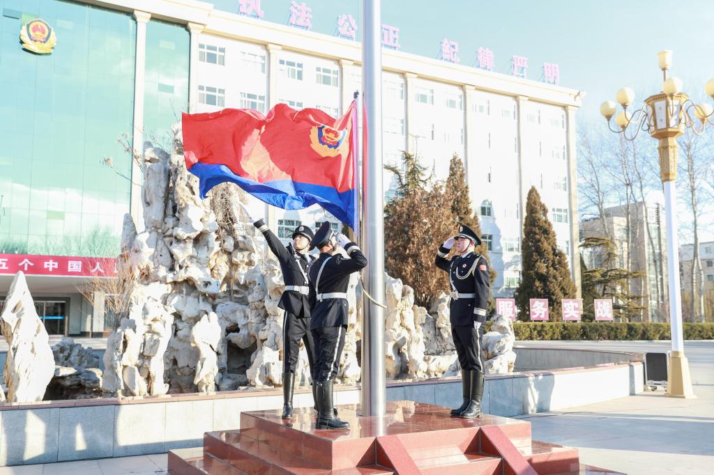 升旗手、護旗手邁著整齊有力的步伐,護送警旗走向升旗臺。伴隨著激昂嘹亮的《中國人民警察警歌》,升旗手迎風振臂,獵獵警旗冉冉升起。全體人員列隊整齊、神情肅穆、警容嚴整,向警旗敬禮、向使命致敬!