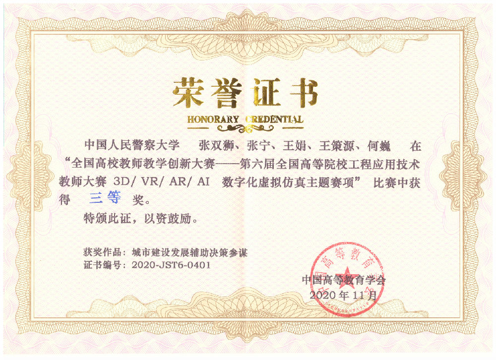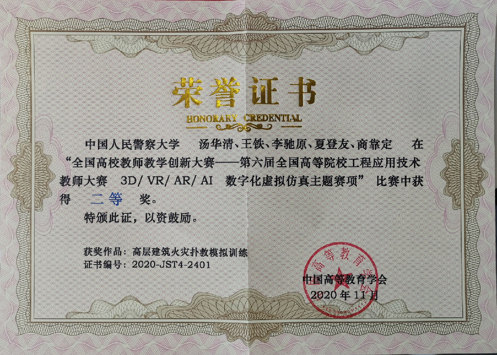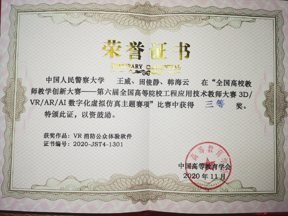 11月10日,由中國高等教育學會主辦的全國高校教師教學創新大賽——第六屆全國高等院校工程應用技術教師大賽-3D/VR/AR數字化虛擬仿真主題比賽頒獎典禮在長沙舉行。本次大賽共吸引全國30個省,238所院校,445個團隊報名,通過前期的校賽選拔和省賽評審,最終240支團隊進入此次全國總決賽,96個團隊獲獎。我校救援指揮學院湯華清、王鐵、李馳原等老師提交的作品《高層建筑火災撲救模擬訓練》獲二等獎,智慧警務學院王威、田俊靜及防火工程學院韓海云老師的作品《VR消防公眾體驗軟件》以及智慧警務學院張雙獅、王娟、王策源等老師的作品《城市建設發展輔助決策參謀》分別獲三等獎。