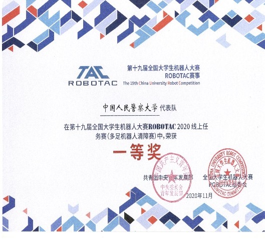 2020年11月9日,第十九屆全國大學生機器人大賽ROBOTAC落下帷幕,智慧警務學院吳春穎、王娟、張雙獅、陳蕾、雒辛芃五位教師帶領16名學生組成的機器人“戰隊”經過頑強拼搏,一舉斬獲自動布障賽和多足清障賽全國一等獎。此次比賽由共青團中央主辦,中國青少年發展基金會、全國學校共青團研究中心支持。