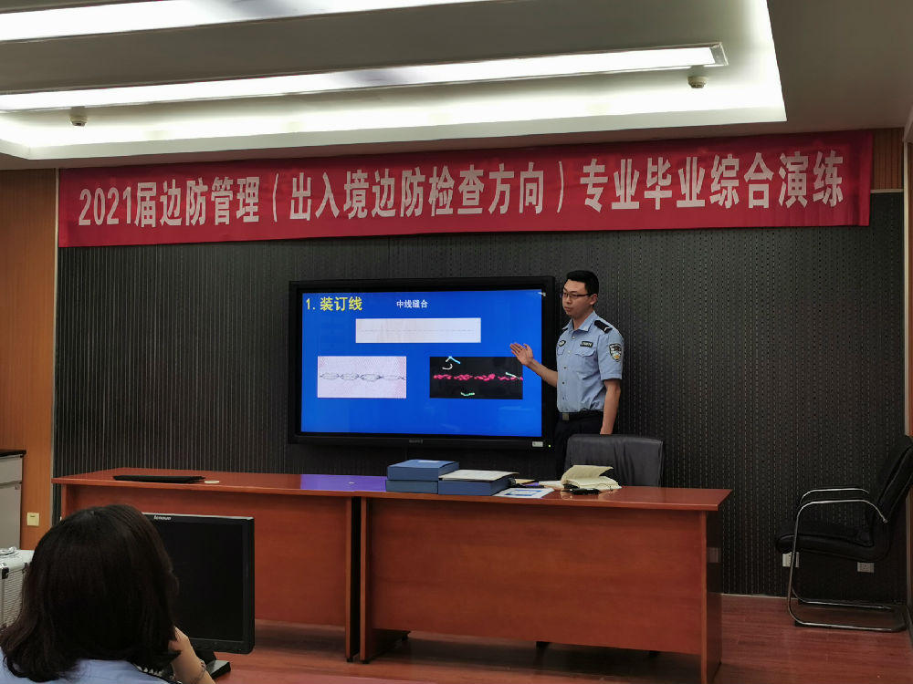 演練內容包括出入境證件鑒別及大型文檢儀操作兩部分。演練堅持以學生為主,突出實操性。演練開始前,由學生小教員、技術保障員、器材管理員與指導老師對接,自主完成備課、器材準備、技術保障等任務。大型文檢儀操作科目,器材管理員負責所需設備的管理與清點,技術保障員進行文檢儀的操作講解與示范。出入境證件鑒別科目,學生小教員進行理論梳理,所有學生逐個操作文檢儀進行證件防偽措施識別,實現理論與實踐的印證,并在課后認真完成實踐報告。本次畢業演練,使學生突破以往“理論為主”的學習模式,實現出入境證件鑒別專業知識與實際操作的緊密結合,真正弄清、弄懂、弄透證件檢驗與鑒別知識。所有畢業學生態度端正、積極參與、認真總結,充分展現了邊防管理專業學生的專業性與嚴謹性。