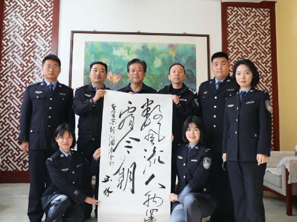 交流結束后,曲教授決定在現場進行創作,在觀摩了書法大家現場的創作后,我們的學生們更是深刻的體會到了書法這一古典的藝術所帶來的美感。曲教授更是為書畫代表以及中國人民警察大學題字,并合影留念,通過此次活動的順利開展,為下一步社團活動打下了良好的基礎。