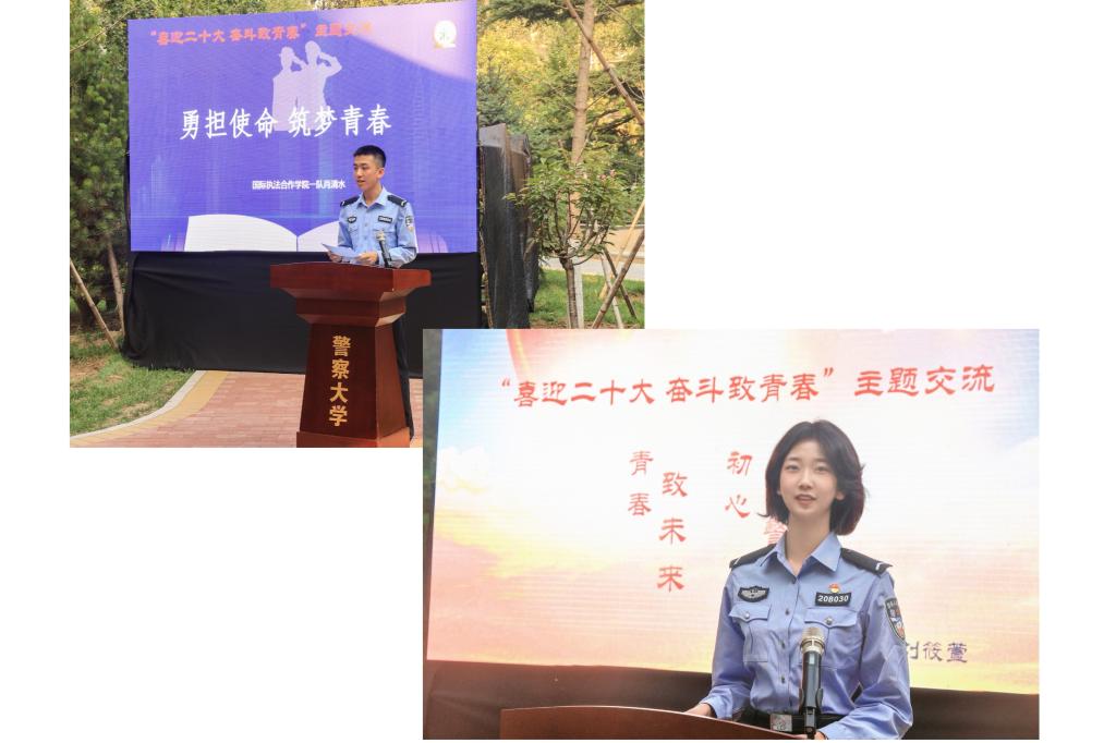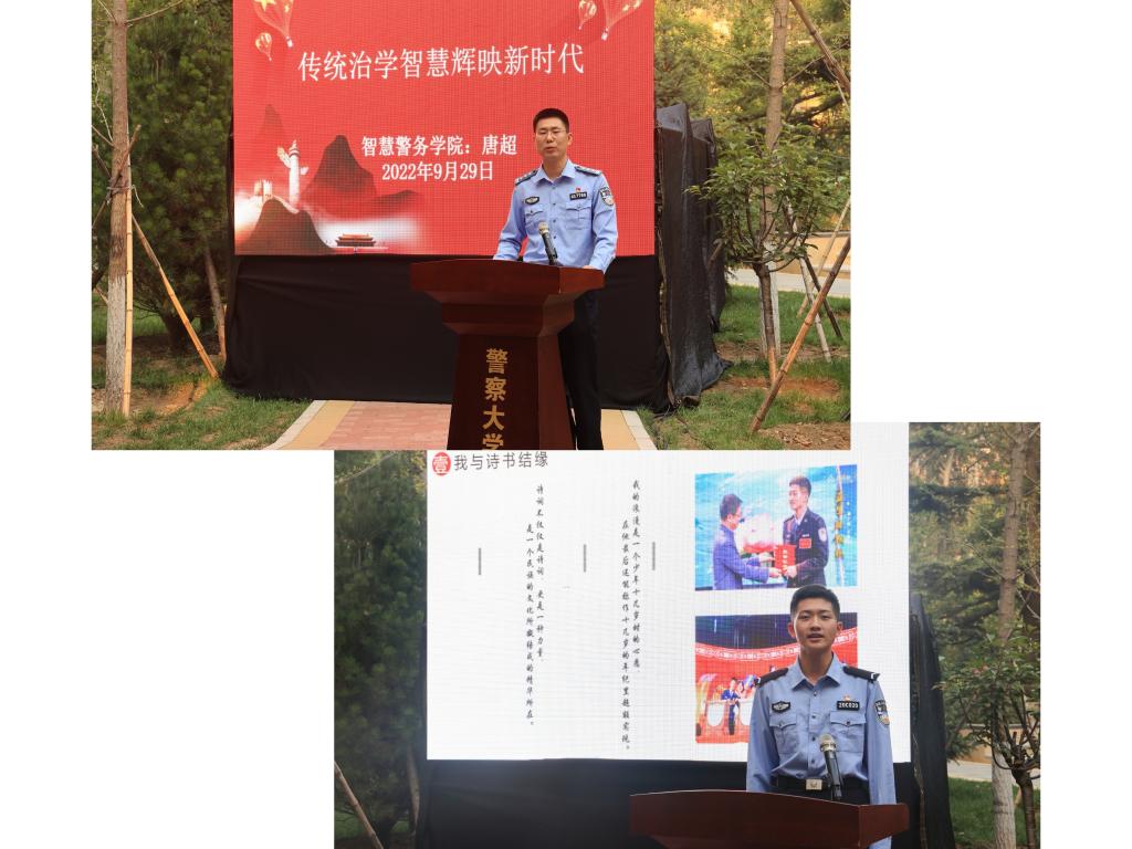 活動邀請了教師、學生代表和三位畢業校友,講述他們書香為伴,砥礪前行的成長歷程。智慧警務學院唐超教授,暢談了汲取傳統治學智慧,做大學問、真學問的學術追求;滕凱楓同學從詩詞中感悟家國情懷,抒發了從警報國的志向;畢業校友何召華、楊勤敞和丁成穩,錄制視頻述說了他們立足本職學習實踐、錘煉本領建功立業的奮斗足跡;劉筱萱和肖清水同學作為“青春對話未來——寫給十年后的自己”書信征集活動獲獎代表,展望了如何在新時代踔厲奮發、如何勝任未來的公安工作。活動現場展出的“警大閱讀十二時辰”攝影比賽優秀作品,記錄了警大學子從晨光微熹到暮色四合,不負韶華爭朝夕的美好閱讀瞬間,展現了警大豐富多彩的閱讀文化氛圍。