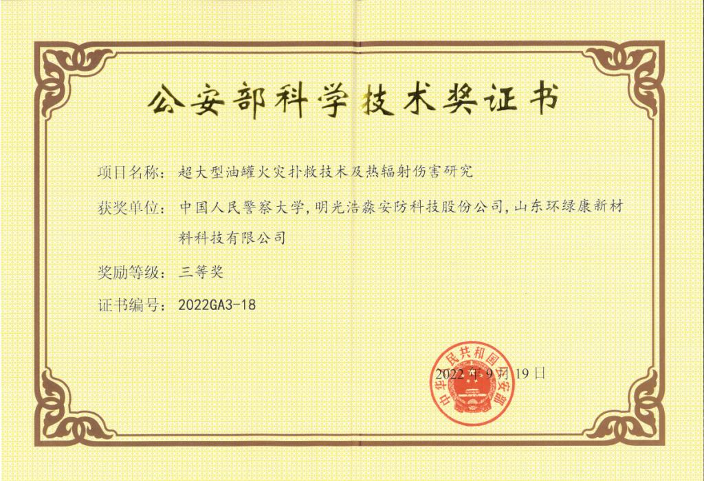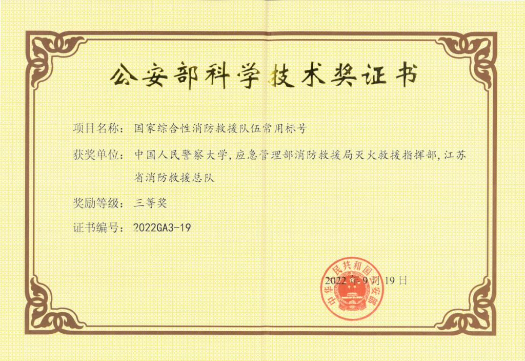 近日,公安部印發了《關于2022年度公安部科學技術獎獲獎項目的通報》(公科信[2022]909號),學校申報的《超大型油罐火災撲救技術及熱輻射傷害研究》《國家綜合性消防救援隊伍常用標號》等2項成果獲得公安部科學技術獎三等獎。