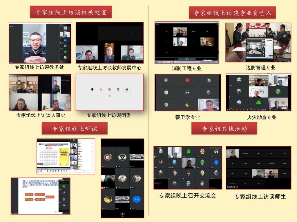 評估主要分為兩個階段,第一階段為10月24日-11月7日,專家組通過線上審閱系統審閱自評報告等支撐材料,10月27日召開了專家組工作動員部署會;第二個階段為11月8日-9日,專家組以線上的形式參加了學校專業建設成效匯報會,聽取了教務處、發展規劃與評估處及四個國家級一流專業建設點關于專業建設與管理的工作匯報;線上訪談了四個國家級一流專業建設點專業負責人、所在學院領導、師生代表,并分別與教務處、人事處、教學保障處、團委職能部門領導進行了線上交流,線上聽評《消防燃燒學》《火災調查》《邊境管理學實訓》等5門課程,召開專家組交流會3次,各類活動共計22場次。
