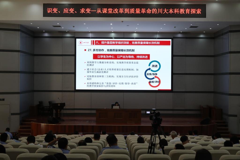 為全面推動學校一流本科教育建設進程,6月30日,學校在綜合教學D406報告廳舉辦“強化一流本科教育與迎評促建工作專題培訓班”第二場講座,邀請四川大學原教務處處長張紅偉教授作“識變、應變、求變——從課堂改革到質量革命的川大本科教育探索”專題報告。相關職能部門領導、學院領導、教研室主任、專業負責人和無課教師共200余人現場參會。