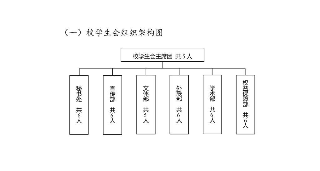 第三十二條 校學生會職能部門是校學生會的日常工作機構,在學生會主席團的領導下開展工作,工作部門設秘書處、宣傳部、文體部、學術部、外聯部、權益保障部等,一般不超過6個。
