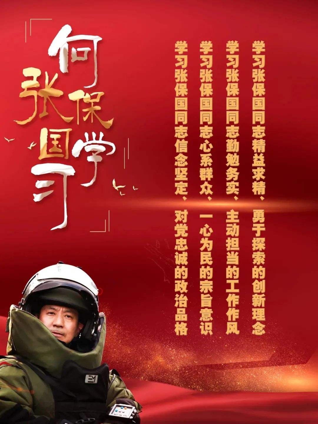 1999年張保國至山東省濟南市公安局工作,自參加工作就堅持戰斗在安檢排爆工作最前沿。20年來,他先后完成重大活動防爆安檢、備勤任務1200余次,成功處置涉爆現場110余次,排除爆炸裝置和可疑爆炸物140多個,鑒定、排除、銷毀各類炮彈、炸彈等4000多發(枚),銷毀廢舊雷管30余萬枚、導火導爆索51萬余米,用鮮血和生命為黨和人民筑起了一道堅不可摧的銅墻鐵壁。在一次次生與死、血與火的考驗中,張保國憑著過人的膽識和精湛的技術與“死神”搏斗,在他成功處置的涉爆現場中,累計排除爆炸裝置20多個,鑒定排除可疑爆炸物130多個。銷毀廢舊雷管30余萬枚、導火索50余萬米、導爆索1萬余米、各類炮彈炸彈等4000余發(枚)。完成重大活動防爆安檢900余次,為保護國家和人民群眾生命財產安全、維護濟南市社會穩定作出了突出貢獻。