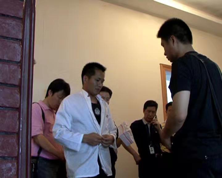 譚紀雄作遲鈍狀,慢慢走向歹徒右手邊桌子,把盒飯放在桌上,打開塑料袋,用余光觀察歹徒。歹徒放松了警惕,人質趁機掙脫。剎那間,譚紀雄向歹徒猛撲過去。門口的兩名談判專家也同時沖上前,用身體掩護人質確保安全。
