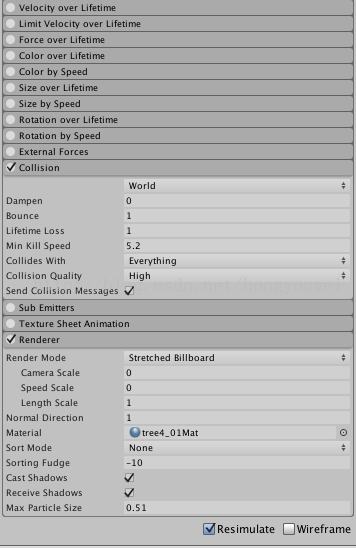 第三項(Lifetime Loss):生命周期損失(0~1),碰撞之后讓粒子損失百分比的生命周期,為1時(生命周期完全損失),可以使粒子消失