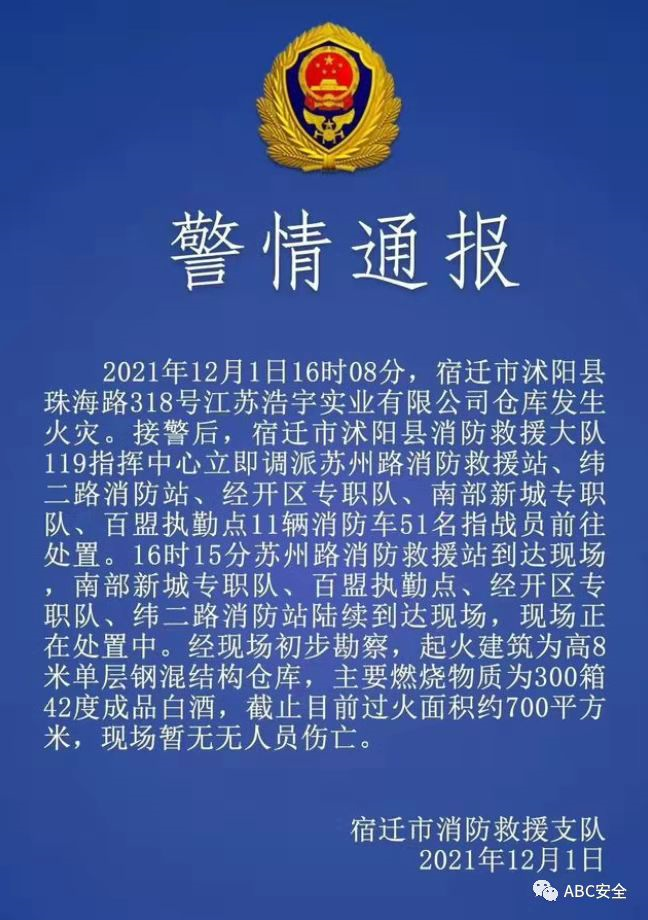 交匯點(diǎn)訊 記者從江蘇省消防救援總隊(duì)獲悉,12月1日16時(shí)08分,宿遷市沭陽(yáng)縣珠海路318號(hào)江蘇浩宇實(shí)業(yè)有限公司倉(cāng)庫(kù)發(fā)生火災(zāi)。宿遷市消防救援支隊(duì)接警后,隨即調(diào)集11輛消防車、51名指戰(zhàn)員前往處置,目前火災(zāi)還在撲救中。經(jīng)現(xiàn)場(chǎng)初步勘察,起火建筑為高8米單層鋼混結(jié)構(gòu)倉(cāng)庫(kù),主要燃燒物質(zhì)為白酒。