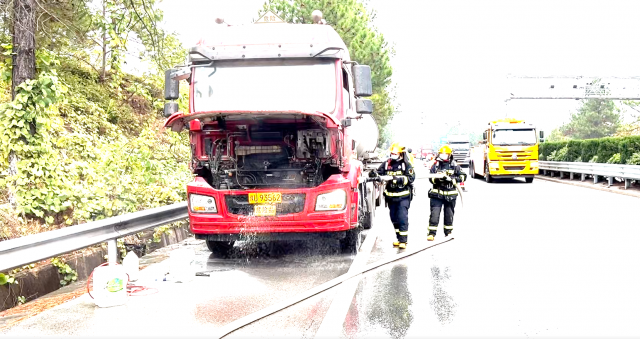 消防救援人員到達現場,發現起火車輛是一輛滿載鹽酸(30噸)的貨車,貨車車頭發動機正處于燃燒狀態,現場不斷冒出焦煳刺鼻的濃煙,車頭部分已經燒焦,現場無人員被困。根據現場情況,消防救援人員一邊設置安全警戒標志,一邊鋪設水帶設置水槍陣地,對車輛火勢進行撲滅。由于車頭發動機溫度過高,為防止陰燃,消防救援人員繼續使用水槍對貨車車頭內部進行冷卻處理,確保車輛不會復燃后。17時46分,護送事故車輛下高速,隨后返回。