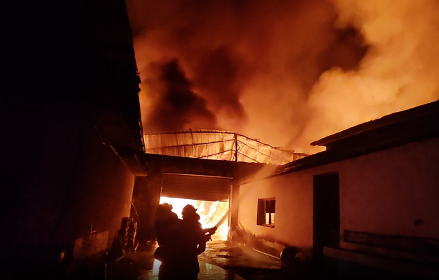 消防救援人員到達現場后發現,起火位置是該竹木加工廠的烘干房,且不時傳來“噼噼啪啪”的竹木燃燒響聲,因廠房內堆積的大量竹木正在猛烈燃燒,火勢已經蔓延至隔壁竹木加工廠,因廠房周邊溫度不斷升高,廠房隨時會有坍塌的危險。在廠房內還堆放了大量待加工的木料,大火借著風勢向東南北三個方向蔓延,現場火光沖天,火焰伴隨著濃煙彌漫到高空,情況十分緊急。