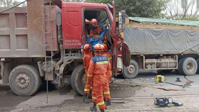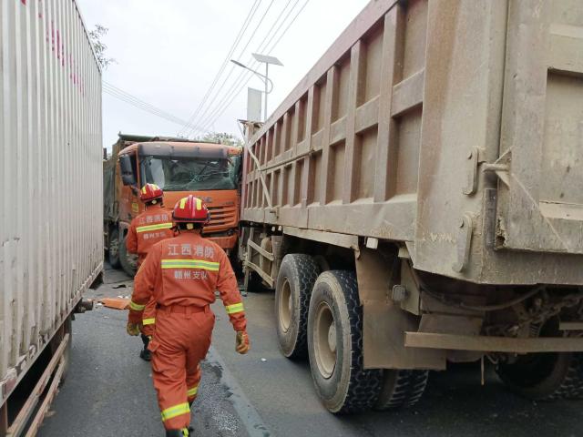贛州:兩貨車相撞1人被困 消防緊急救援