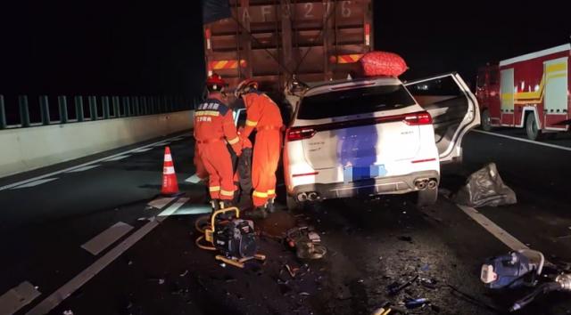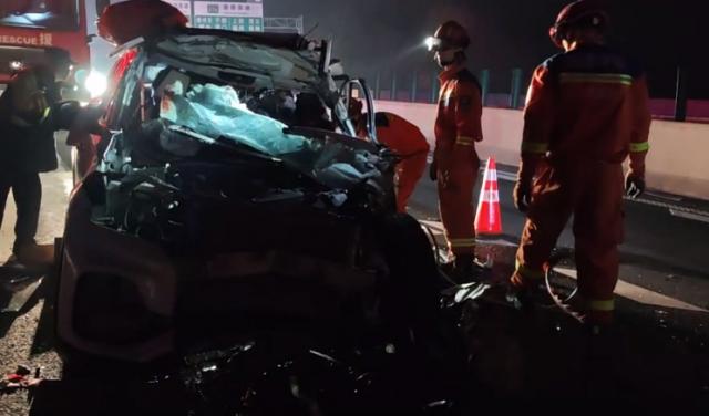 1月1日4時,南龍高速贛州市南康段往十八塘方向一輛小車追尾貨車,2人被困。當地消防部門接到報警后,立即趕赴現場處置。