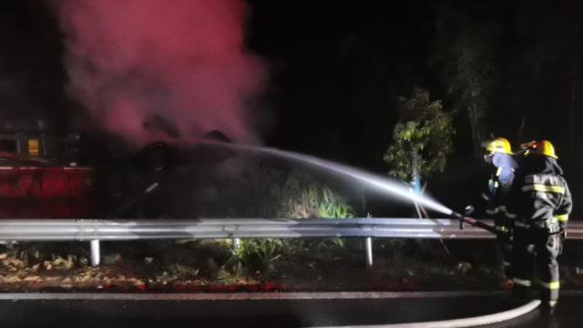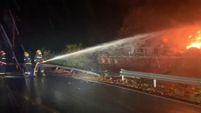 鷹潭:貨車爆胎沖出防護欄引起火災 消防緊急救援