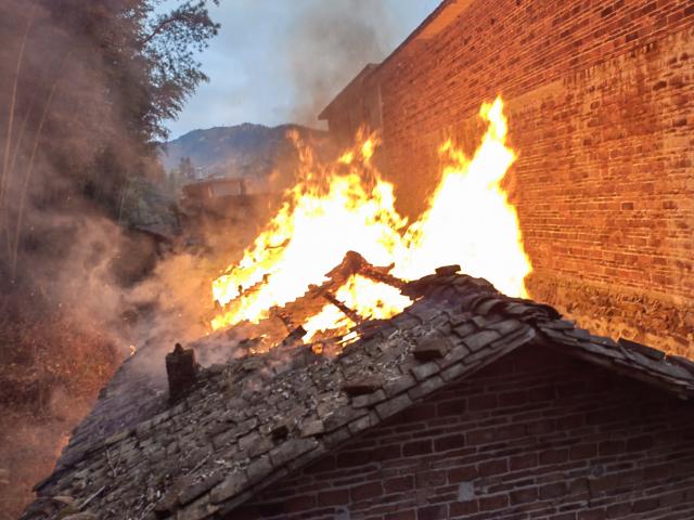 消防救援人員到達現場后發現,著火建筑為一磚木結構的房屋,著火點為廚房,無人員被困,著火物質是廚房內存放的一些干柴和雜物,現場火勢正處于猛烈燃燒階段,屋頂已被大火燒穿,滾滾黑煙不斷往外冒出。