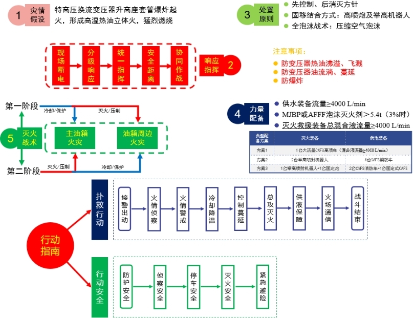 《特高壓換流變火災撲救技戰術指南》主要包括處置原則、響應指揮、作戰編程、撲救行動、行動安全及特高壓換流變壓器結構布置方式與處置難點。