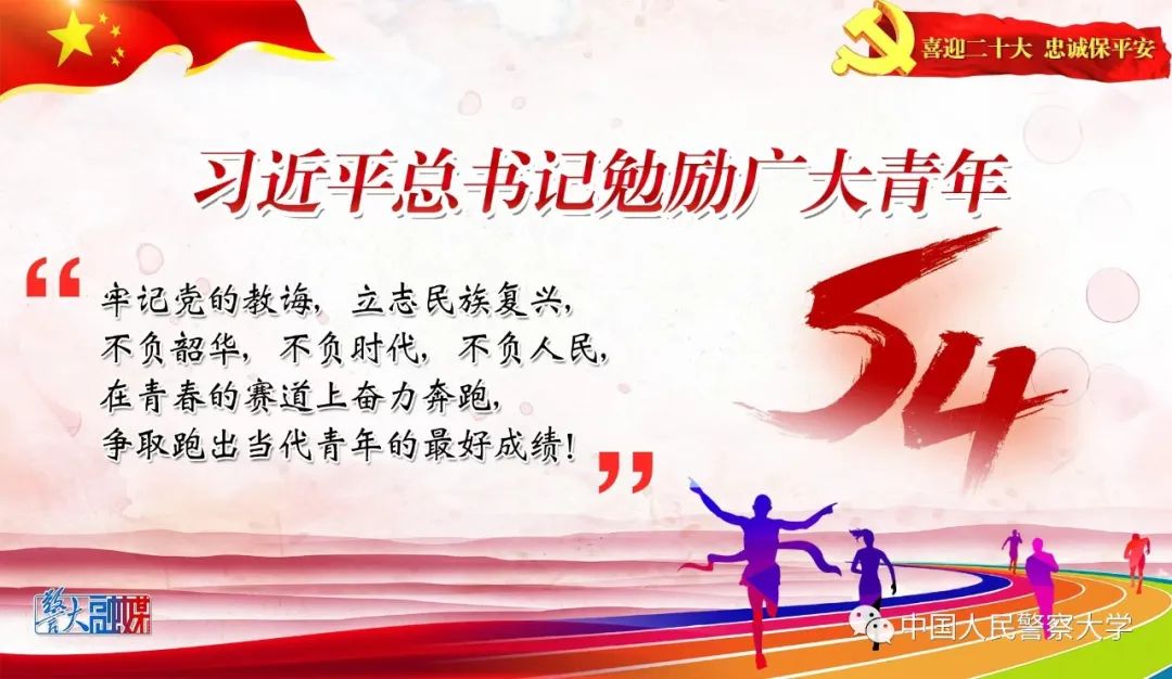 國勢之強由于人,人材之成出于學。在五四青年節即將到來之際,習近平總書記來到中國人民大學考察調研,勉勵廣大青年在青春的賽道上跑出當代青年的最好成績。立足新時代新征程,中國青年的奮斗目標和前行方向就是堅定不移地聽黨話、跟黨走,努力成長為堪當民族復興重任的時代新人,于時代洪流中踔厲奮發、勇毅前進。作為警大學子,我們更應時刻牢記身上的責任,要把今天的學業、明天的事業同國家的需要、人民的需要緊密聯系起來,為成為一名優秀的人民警察而不懈奮斗!