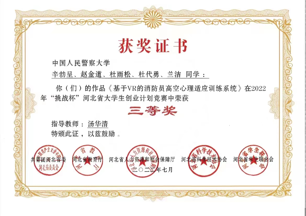 為培養(yǎng)學(xué)生科技創(chuàng)新能力,培訓(xùn)學(xué)生興趣愛好,2022年4月救援指揮學(xué)院虛擬仿真實驗教學(xué)中心興趣小組,在科研處的精心組織與帶領(lǐng)下,指導(dǎo)老師湯華清精心挑選研究(本科)生辛勃呈、趙金道、杜雨松、杜代勇、蘭潔等同學(xué)組成參賽隊伍,參加由共青團中央、教育部、中國科協(xié)、全國學(xué)聯(lián)和省級人民政府主辦的中國大學(xué)生創(chuàng)業(yè)計劃競賽,并提交作品《基于VR的消防員高空心理適應(yīng)訓(xùn)練系統(tǒng)》,榮獲2022年“挑戰(zhàn)杯”河北省大學(xué)生創(chuàng)業(yè)計劃競賽三等獎。