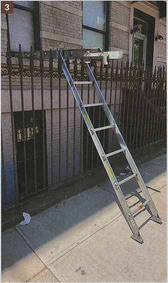 面對鐵柵欄時,在一樓搭梯子的一個簡單而快速的解決方案是使用 A 型架組合梯。不要從人行道上部署這種梯子,以懸臂的姿勢越過圍欄。梯子在這個位置時,將很難攀爬、橫移和操作。當你和受害者在上面移動時,它也可能從窗臺滑落。如果它滑出窗臺,你和受害人都可能向下墜入”護城河”而受傷(照片 3)。