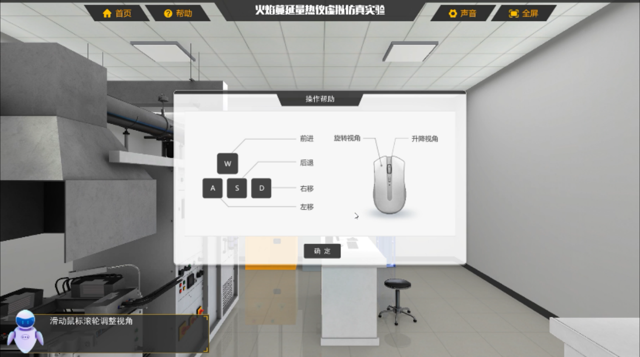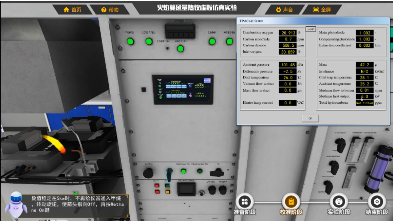 火焰蔓延量熱儀虛擬仿真實驗軟件項目以實驗室、FPA儀器、通風(fēng)柜、空氣壓縮泵、水閥、電源開關(guān)箱和管道為對象建立虛擬訓(xùn)練場景,主要操作練習(xí)模塊包括設(shè)備認(rèn)知、儀器打開前的準(zhǔn)備工作、儀器校準(zhǔn)工作、PMMA材料燃燒性能測定以及結(jié)束階段模塊。通過本實驗,幫助學(xué)習(xí)者進行FPA操作練習(xí),提高人員大型設(shè)備操作和測試能力。